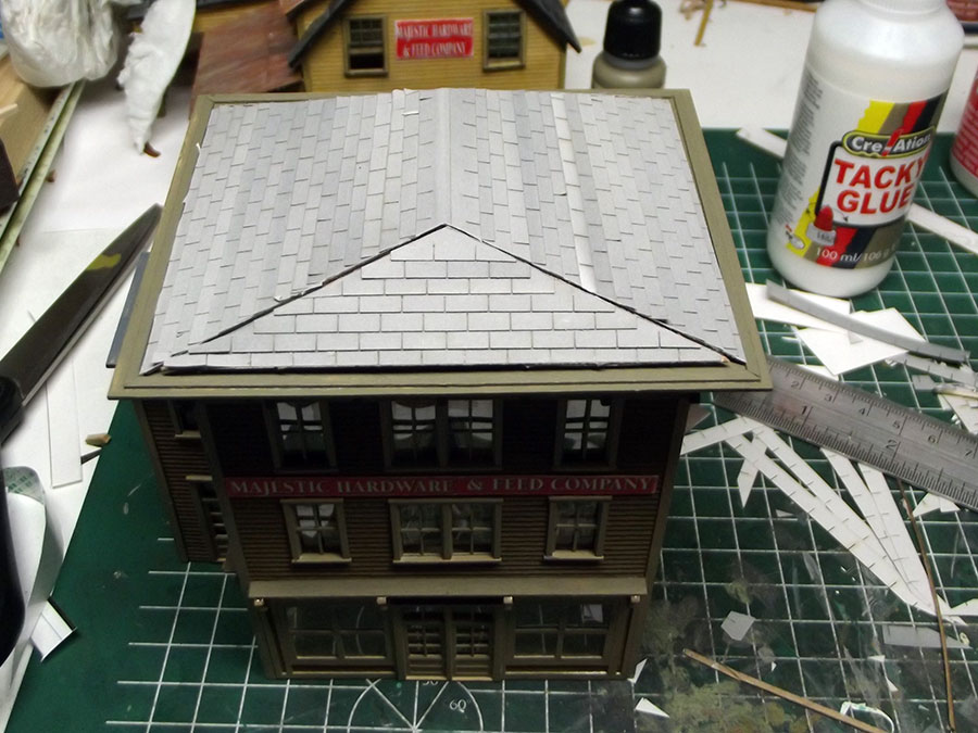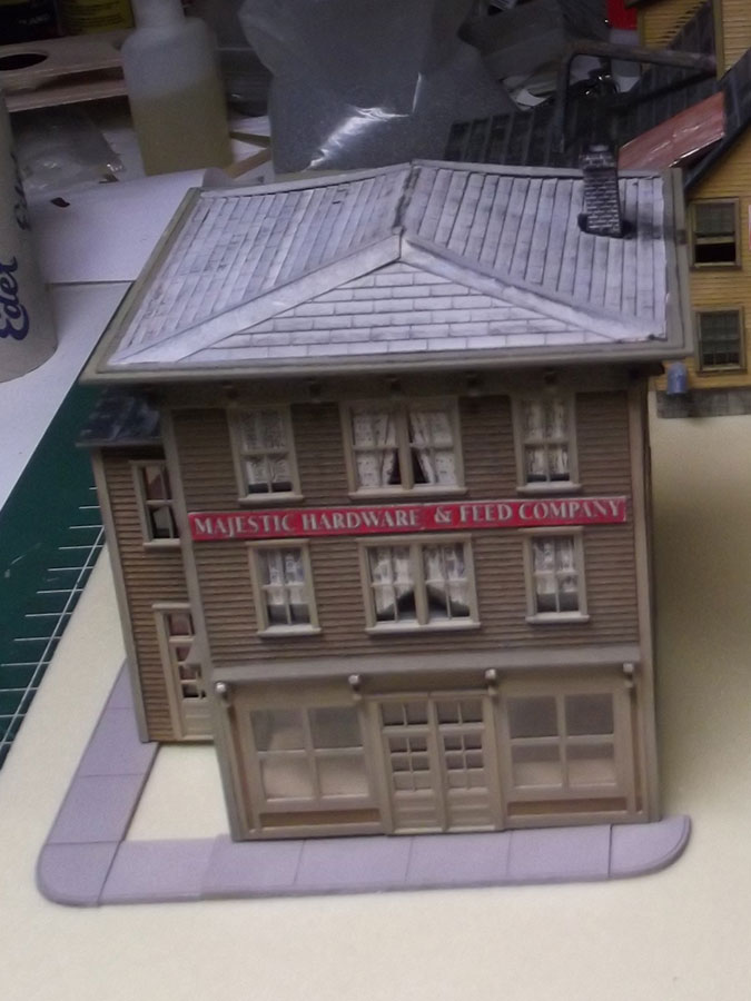 Roof finished and weathered, this structure will now go on to be part of the Majestic Hardware build.