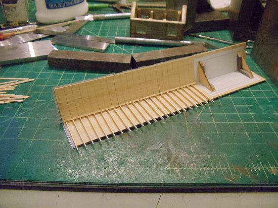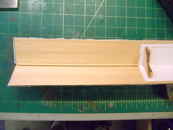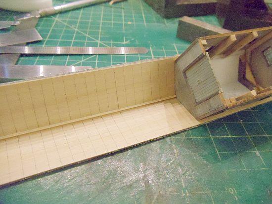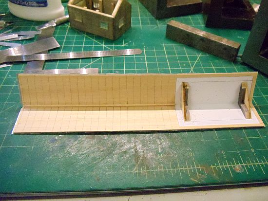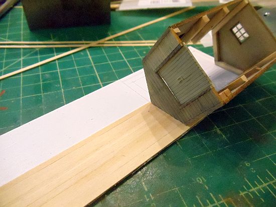 The kit came with two gable pieces the same angle as the office end walls. I glued these in place on the under side of the rood card. These blocks set the correct angle of the roof and also aid in the correct positioning of the roof on the office.