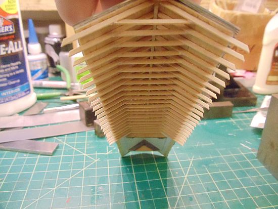 The instructions call for the rafters and ridge beam to be stained and heavily weathered. So I said to myself, "Self, what is the purpose of badly weathered rafters and ridge beam not exposed to the elements?" Anyway, it didn't make sense to me.
