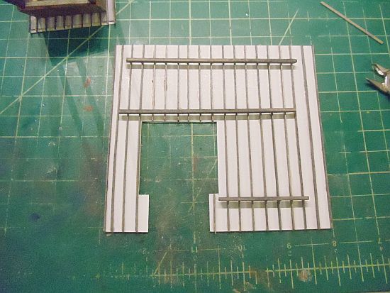 Instead, I used two pieces of Evergreen Scale Models styrene strips. I used .010 X .125 (1/8") styrene. I glued one end to outside edge of the scale 6X8.
