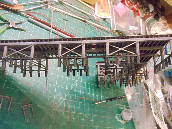 I applied two coats of Hunterline Creosote A&I to the lower piles and the horizontal braces. This is to show that  the piles have been in the water a long time.