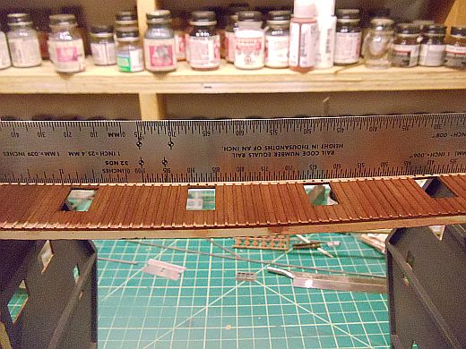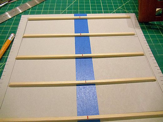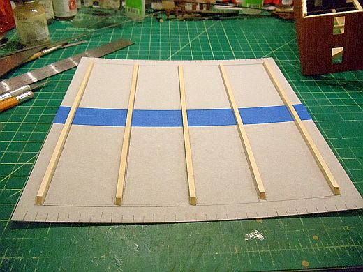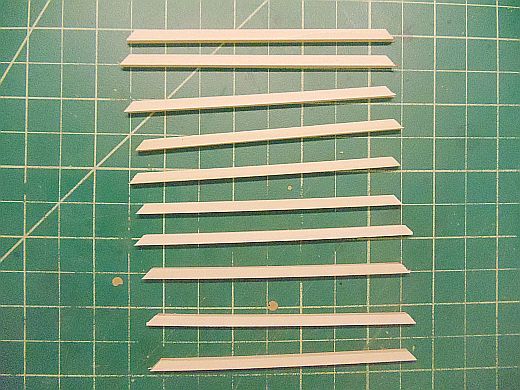I then used the scale stripwood and cut five pieces the distance between the side lines on the roof panel. I cut each end at a 45 degree angle.