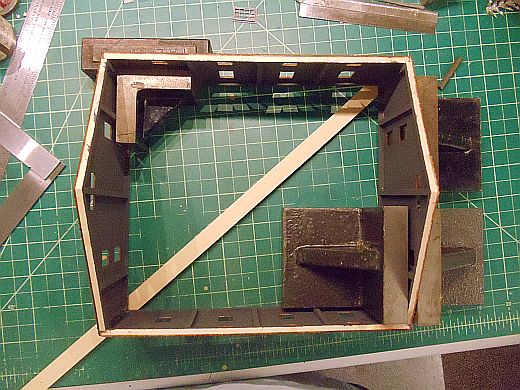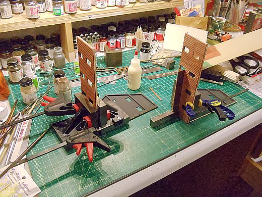Tom - I cut a piece of styrene the inside dimensions of the structure making sure it is square and true, and then cut a rectangle out of the centre to give access.  By adding this to the base you address both the buildings squareness and the warped walls.  In taller buildings I add one at each floor level.  Coming on nicely.