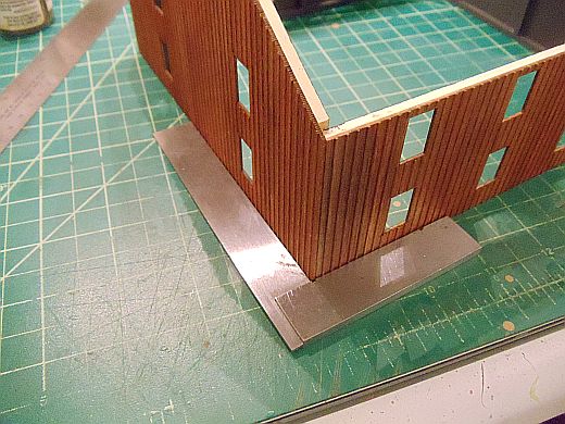 I placed the building over a piece of stripwood 1/4" x 1". I then used weights to get the walls square. I then positioned the stripwood under the opposite corners and marked it with a pencil.