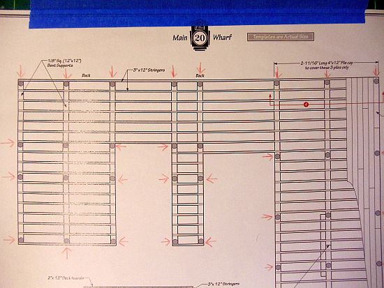The red arrows point to the spots where the secondary pilings are to be glued to the bottom of the structure. The red arrows give me a guide where "NOT" to place glue to hold the 12 X 12 dock bent supports on the template.