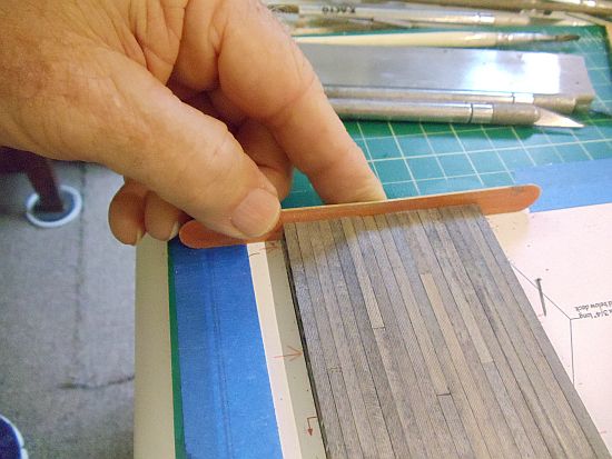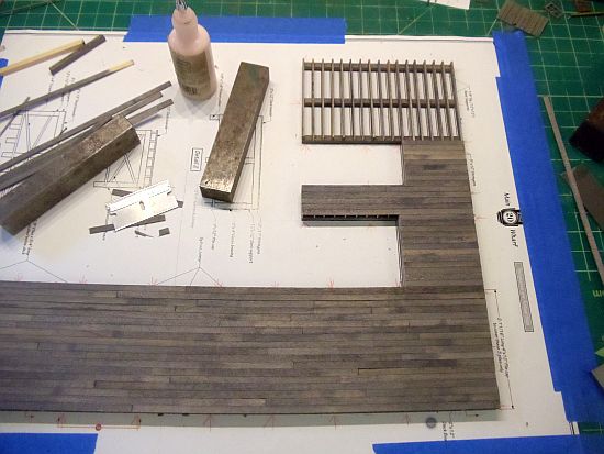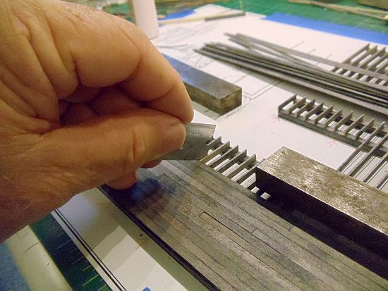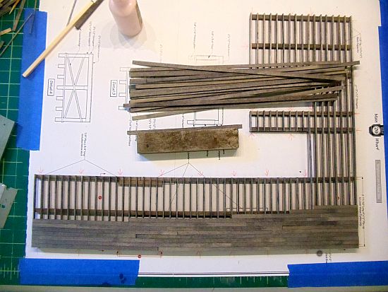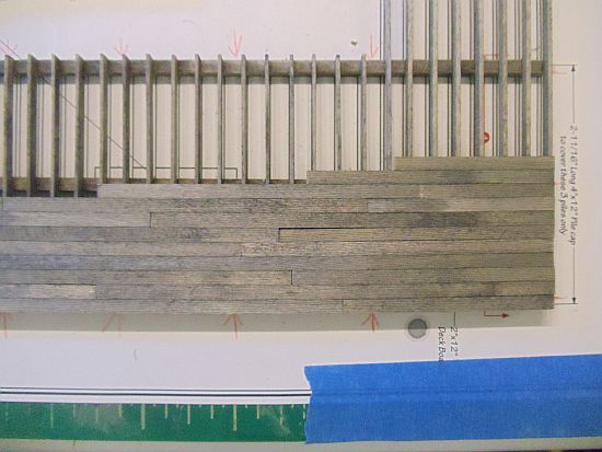 As I glue them on, I cut the deck planks in various lengths no longer than 18 HO scale feet. I then started gluing them to the stringers, staggering the planks so it appears they are individual lengths and not all the same length.