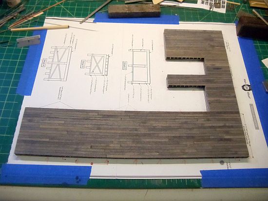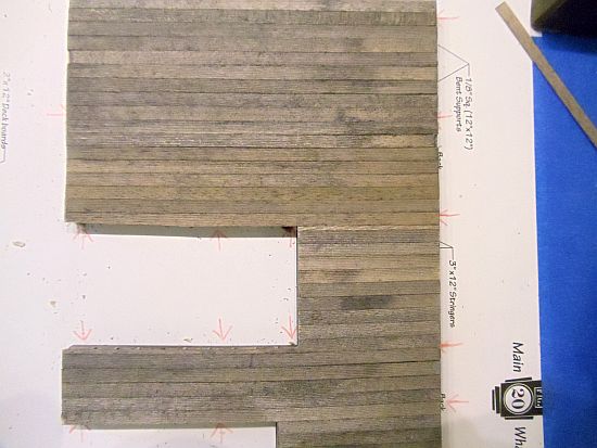 When the stringers were dry I started adding the 2 X 12 deck planks. The portion of the dock in the bottom of the photo is the closet to the layout edge and easily seen by visitors.