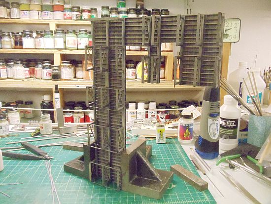 All the horizontal bracing and primary piling were added. Finally, I'm finished with building the three dock assemblies. I still need to do a little further weathering. I'll cover that process later in the thread.