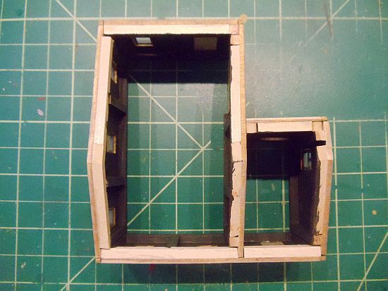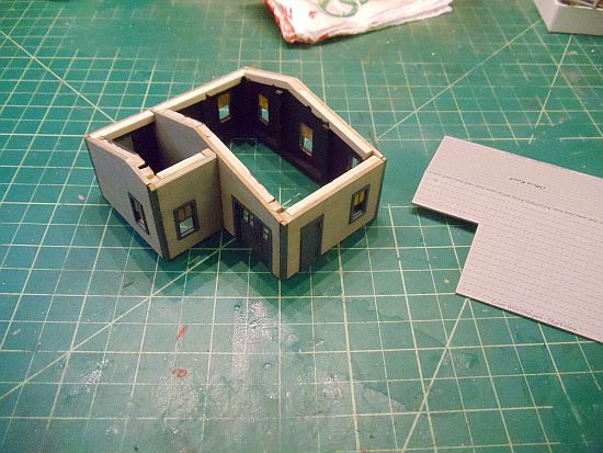 I cut the roof card stock per the instructions, placed it on the office and marked the interior walls. This will help me line up the roof to the building later when glued.