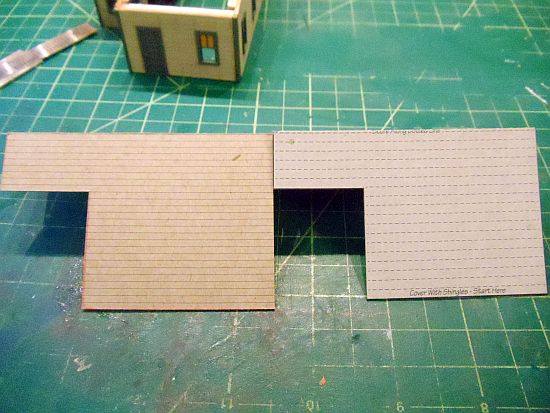 After taking the picture of the shingles and roof section, I noticed the dotted lines on the roof card are the same width as the shingles. Each row of shingles will fit between the dotted lines. Not sure if this was done on purpose or by accident but I won't be using the roof section that came with the kit.