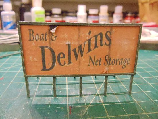 I forgot to mention I cut the sign in four sections as if it were a bill board sign. You can just barely see the separations in the photo below. I used a #17 Xacto blade to peal back a corner at the top of one of the sections.