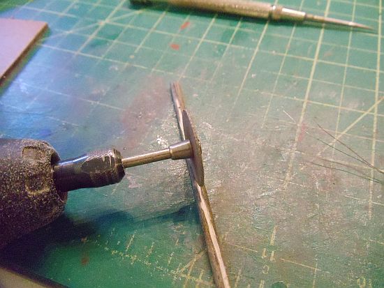I then took the 1/8" dowel. They came in the kit and were precut to the needed length. I cut a small groove down the side of the dowel. I used the Dremel and cut off disk for cutting the groove. My groove wasn't exactly straight but it won't show in the end.
