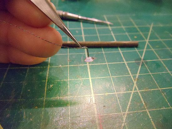 Take the wire and insert it in the hole where the support will be glued. Then gently move it towards the other hole. I say gently as you don't want to unbend your 90 degree bend.