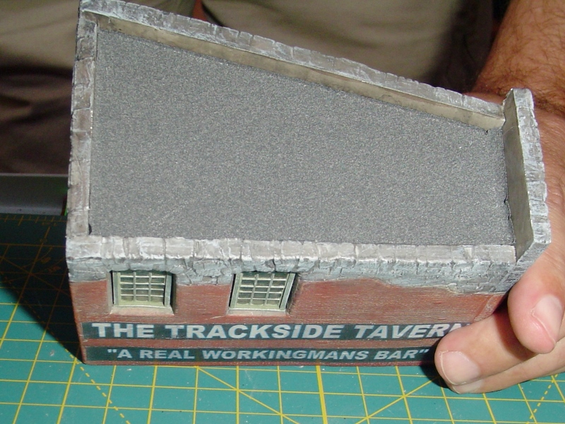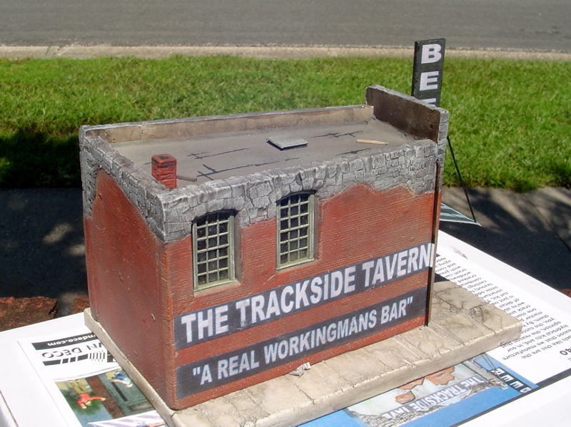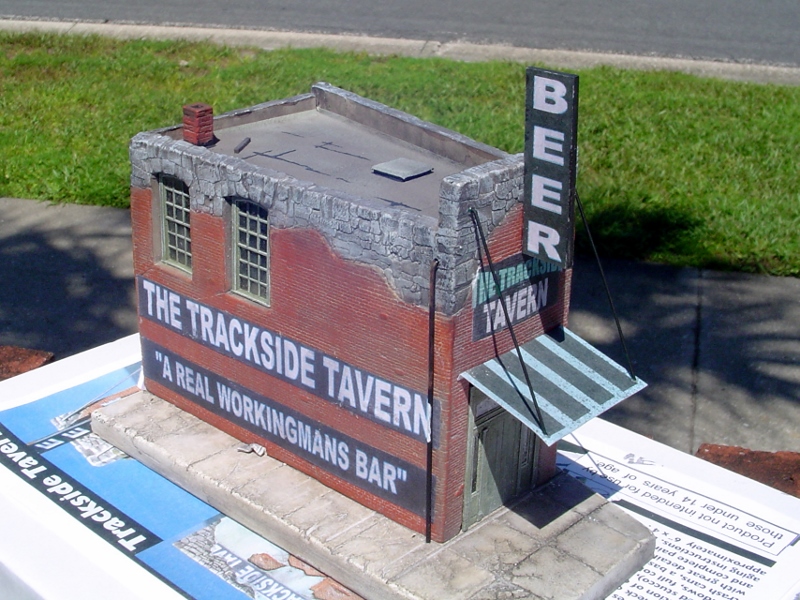 Here's the finished structure.  I add some downspouts (which hide the joints) some pitch 'repairs' to the roof, the chimney, the awning and the beer sign.  I did something a little extra when installing the beer sign, rather than simply gluing it to the wall with CA I drilled two tiny holes in it and glued a short piece of wire into each hole.  Then I lined it up on the front wall and used the wire pins as a guide to drill holes into the wall for the wires to go into.  Then I glued it in place.  Just a little extra support for the joint.  I also added some chipboard under the awning (with 3M Transfer Tape) to give it some strength and to keep it from developing a wavy appearance over time.