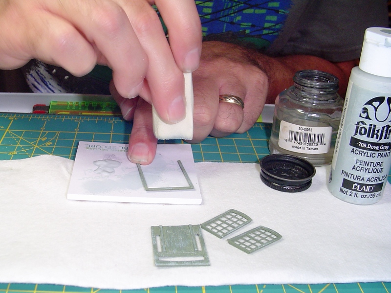 The doors and windows....well, there's an interesting story with the doors and the windows.  I opted to spray them with a rattle can, some camo green color, rather than an airbrush.  I taped them down to the tray face down and sprayed the back first.  Just to practice with the rattle can and to see if I liked the color.  They looked good.  So, when they dried I flipped them over and sprayed the front.  They didn't look right as I was spraying them.  They looked speckled with light and dark dots of paint.  I tried a couple of coats and only ended up building up layers of speckles.  Arrrghhhh!  I put them aside figuring I'd have to get some replacements.  After the paint set I decided, on a whim, to scrub them with some fine steel wool.  The speckles came off and the underlying surface looked pretty good.  Whew... :D  So, anyway, at this point I'm dabbing them with a sponge with a little gray paint on it to get a peeling paint effect.  I'll dip them in A&I and drybrush them with and off white after the A&I dries.