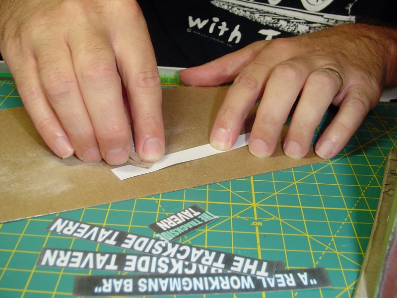 The "Beer" sign that's mounted on the front of the building is made up  of two signs and a piece of styrene.  I trimmed the styrene to match the size of the signs and then applied 3M Transfer tape to the styrene and trimmed it to fit.