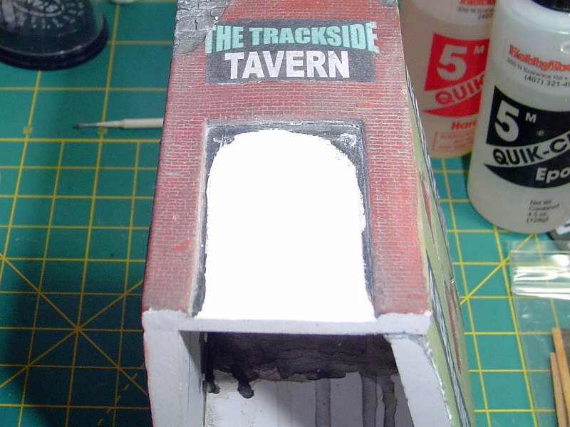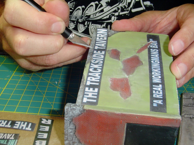 At this point, while waiting on a wash to dry, I cut out all the signs and awning with a sharp blade and a steel straight edge.