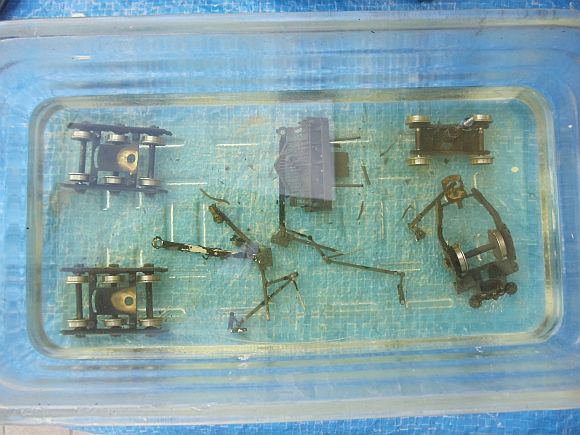 I have an old glass Pyrex bread bowl to soak the brass in the Acetone. I start with the small parts and work my way up to the tender and boiler.