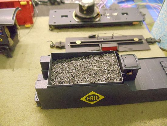 Time for the coal load so I got my jar of fake coal. I use the fake coal as a bottom layer only. Once the bottom layer is in place and the DCC is installed I'll add the official looking coal to the tender bunker.