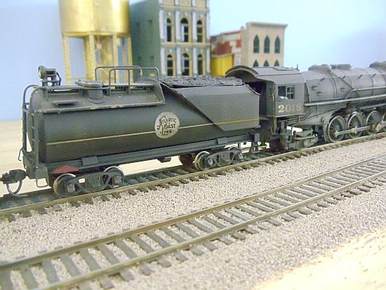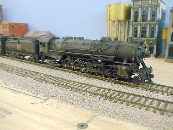The loco is a very old Akane USRA 2-10-2. I can't tell if it's a 1963 or 1968 model of the Santa Fe type. The center driver is blind, meaning the driver doesn't have a flange on the tire. The loco has a DCC Tsunami decoder installed. And, I must say the loco runs very smooth and sounds good but the chuff is a little to weak for my liking. I said it sounds good but the sound could be better. I plan to have the TCS WOW sound installed.