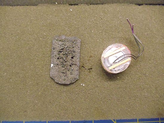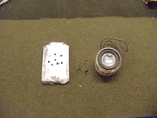 To start with, the sound was directed up through the coal load instead of down through the tender. The next two pictures show you the coal load and speaker. The coal load was glued to a piece of styrene and holes were drilled through the styrene and coal load. There weren't enough holes for the sound to escape.