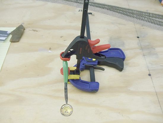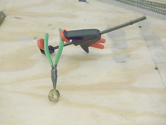 To continue my Rube Goldberg theme, I used a large clamp to hold the small clamp that holds the small pliers that hold the smoke box front. Sorry, I couldn't resist.