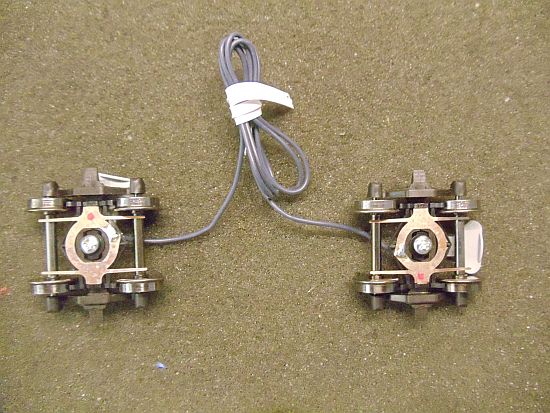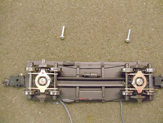The Kadee trucks are Delrin/hard plastic. The wire is soldered directly to the brass contacts on the truck and it appears the contacts are super glued to the truck. The contacts only touch the axles for electrical pickup. The wire goes up through the bottom of the car to the lights. The trucks don't conduct electricity.