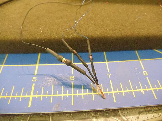 In the photo below, I have the interior light wired to the 150 Ohm resistor. The other two resistors are wired one each to the blue wire.