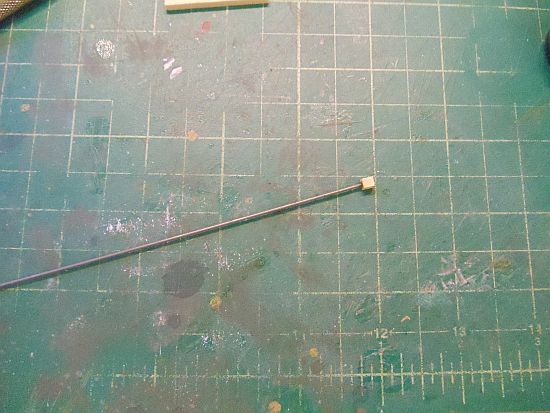 For the scupper I cut a small square of 10X10 scale strip wood, drilled a hole in one end and glued a .019 piece of wire in the hold.