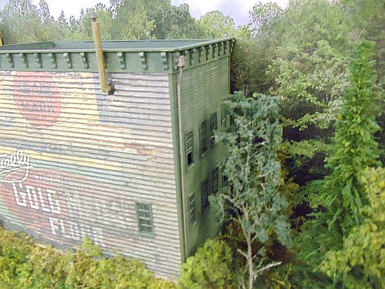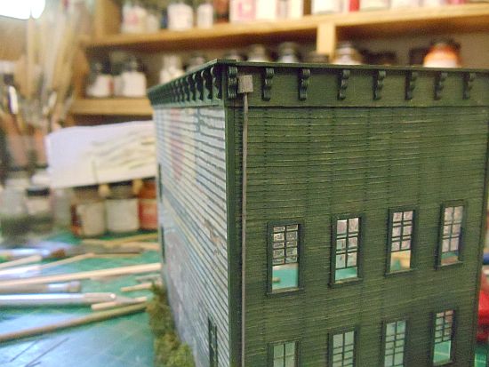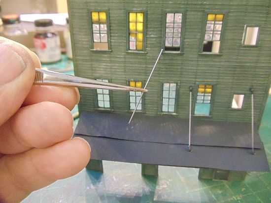 I bent the wire to fit the building and then painted it with Floquil Old Silver. It was then glue to the corner of the structure.