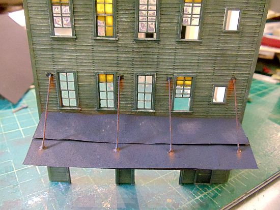 I made a new canopy for the front and extended it to cover the office door. I cut four, equal in length, wire supports from .025 wire. I dipped both ends into some Gallery Glass Liquid Leading and used tweezers to place the wire on the canopy and front wall.