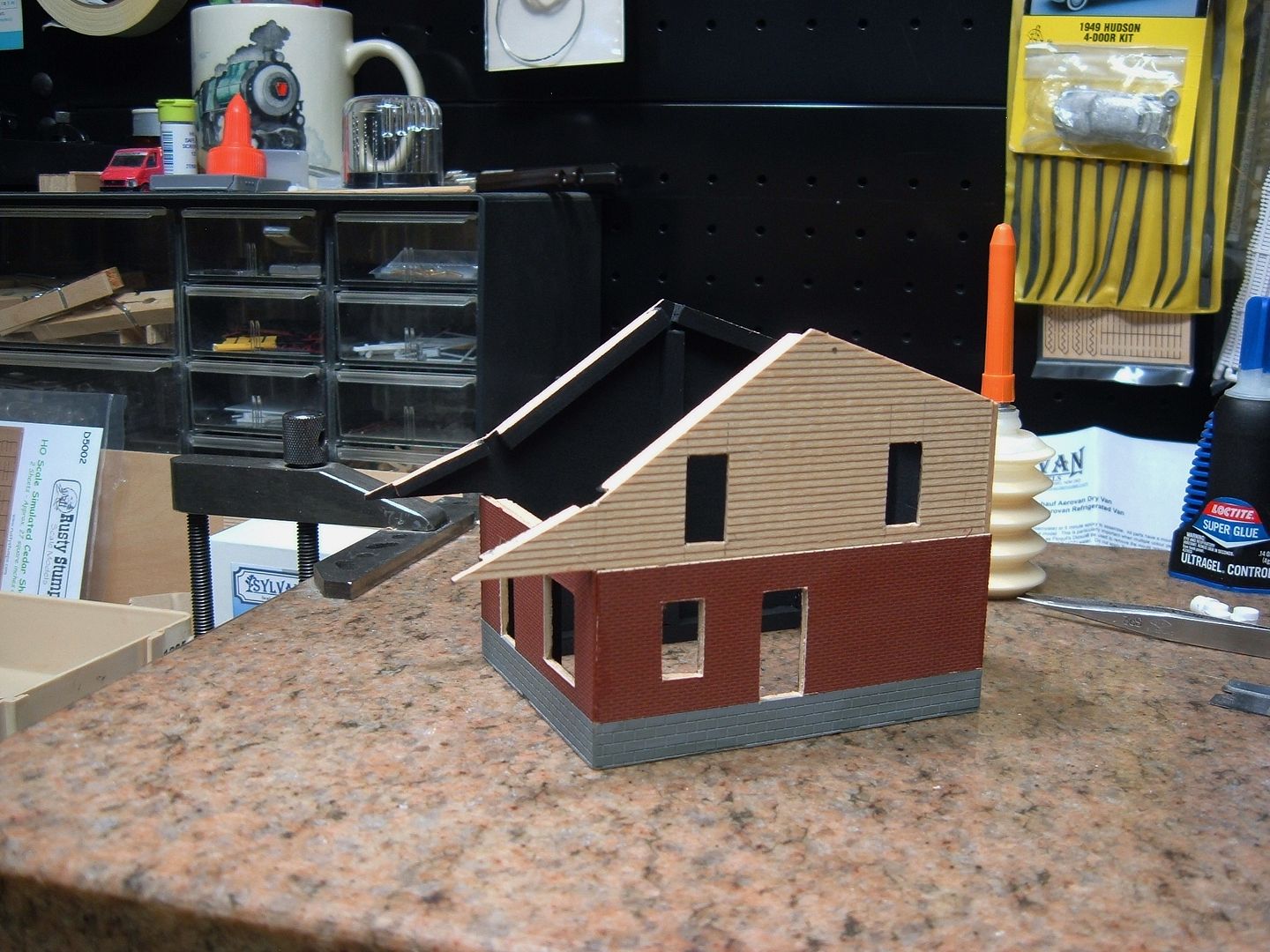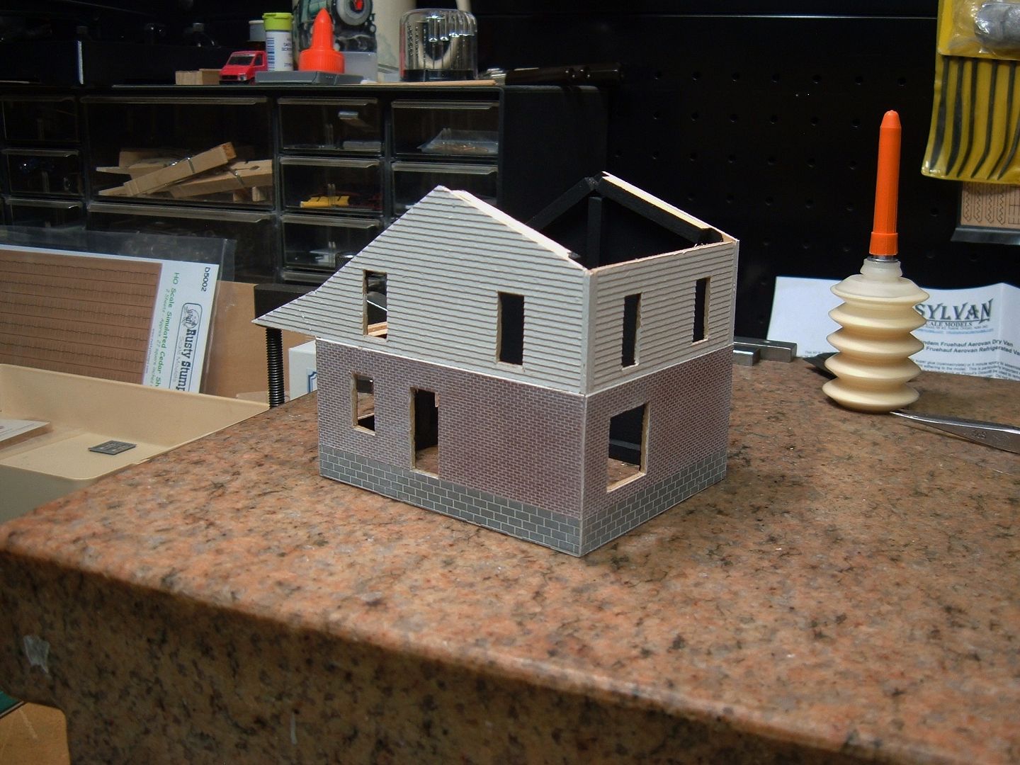 I have added the brick and block foundation. I will touch up the white spots and add mortar after I cut out the openings for the doors and windows.