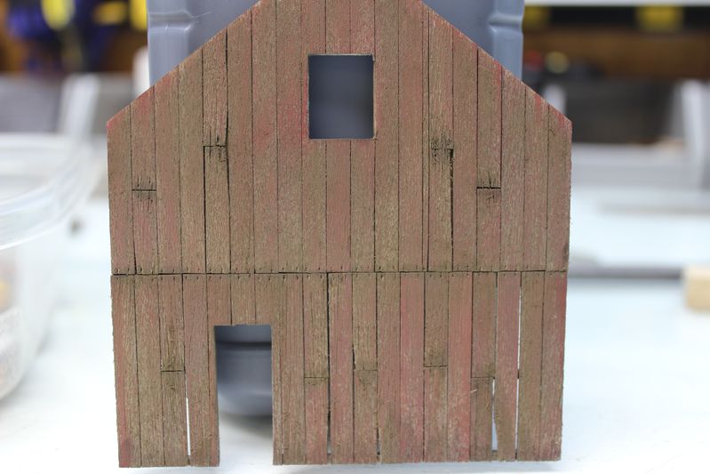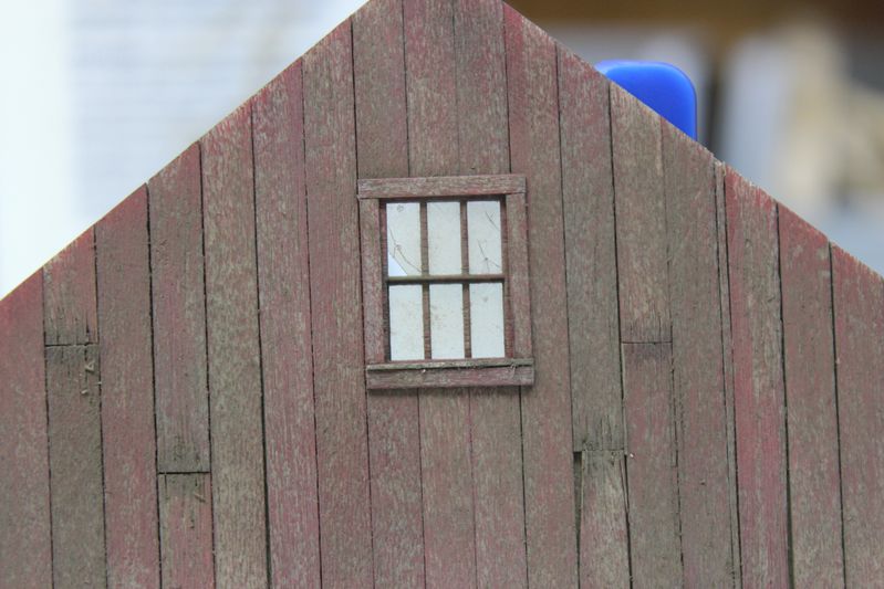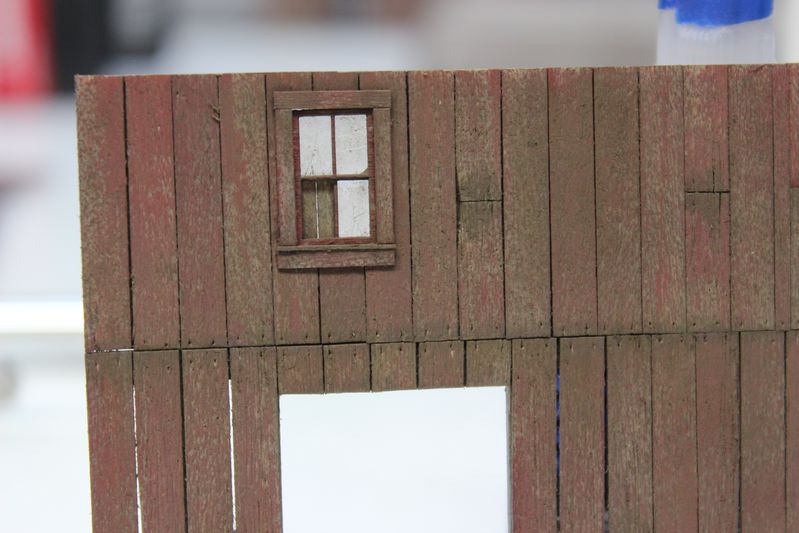I added the windows in place. I colored the windows a little different from the siding. Instead of using Brett's wet brushing method I use a stiff brush and use a blotting type technique to apply uneven paint. This kit does not have laser cut acetate for the windows so it took a little bit longer to add and detail all the glass.