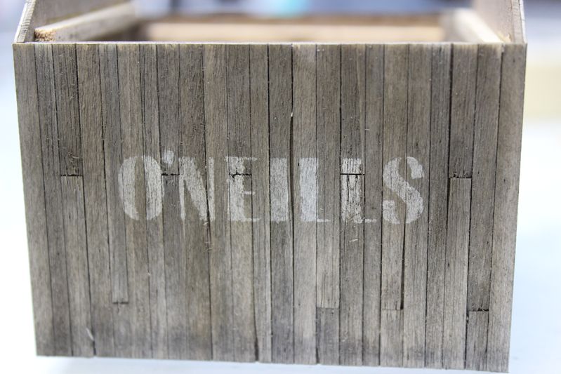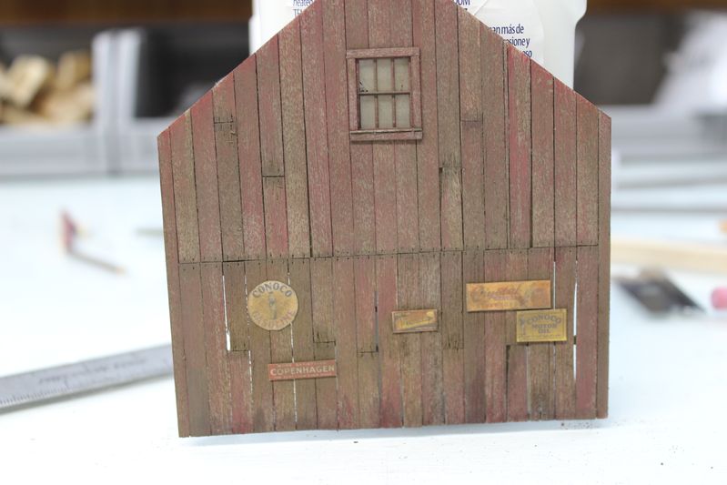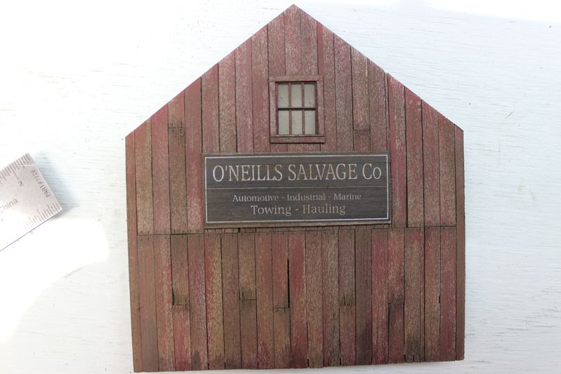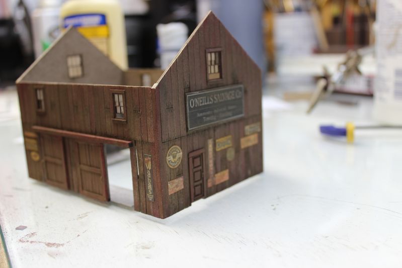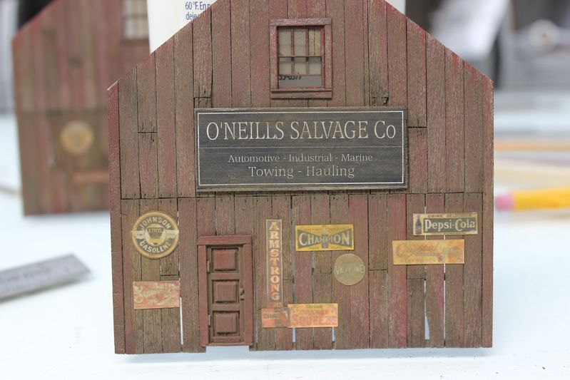 I made up a sign for the side wall to match the signs on O'Neills. My plan is to have evidence that the yard used to be Quincy Salvage but was purchased by the neighboring O'Neills Fabrication Co. I will probably make some signage labeled for Quincy's and add it to the trash pile behind one of the sheds.