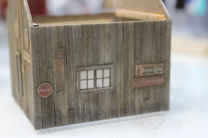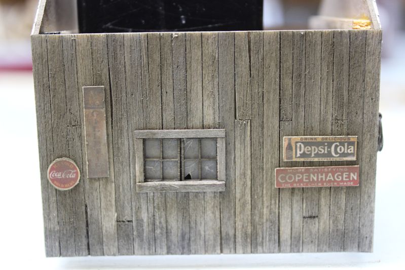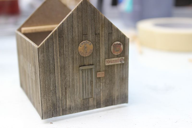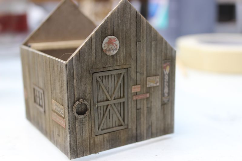 Next step was building this storage shed. I colored the walls with 2 coats of A&I, once everything was attached I dusted all the walls with Rembrandt 408.3 mixed with a few other shades of brown. The structure has no interior details, its build over a cardstock core so it was pretty quick to assemble.