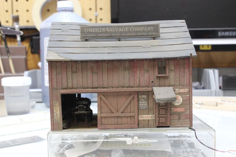 I was pretty unhappy with how the roof sign looked, the lines really conflicted with the sagging roof peak so I removed it. I covered up the glue marks with some tarpaper patches and chalk.