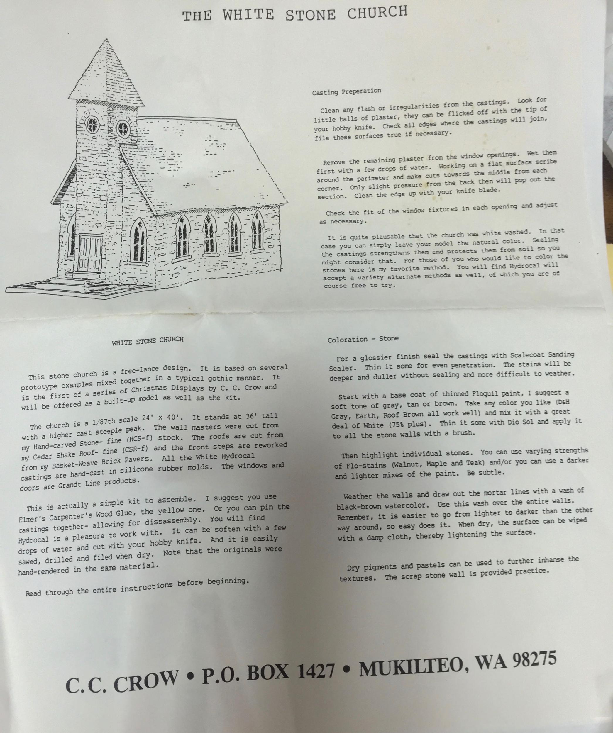 I just checked  C. C. Crows website and this kit is still available. It is officially called  "The White Stone Church".  I'm not sure mine will be white.