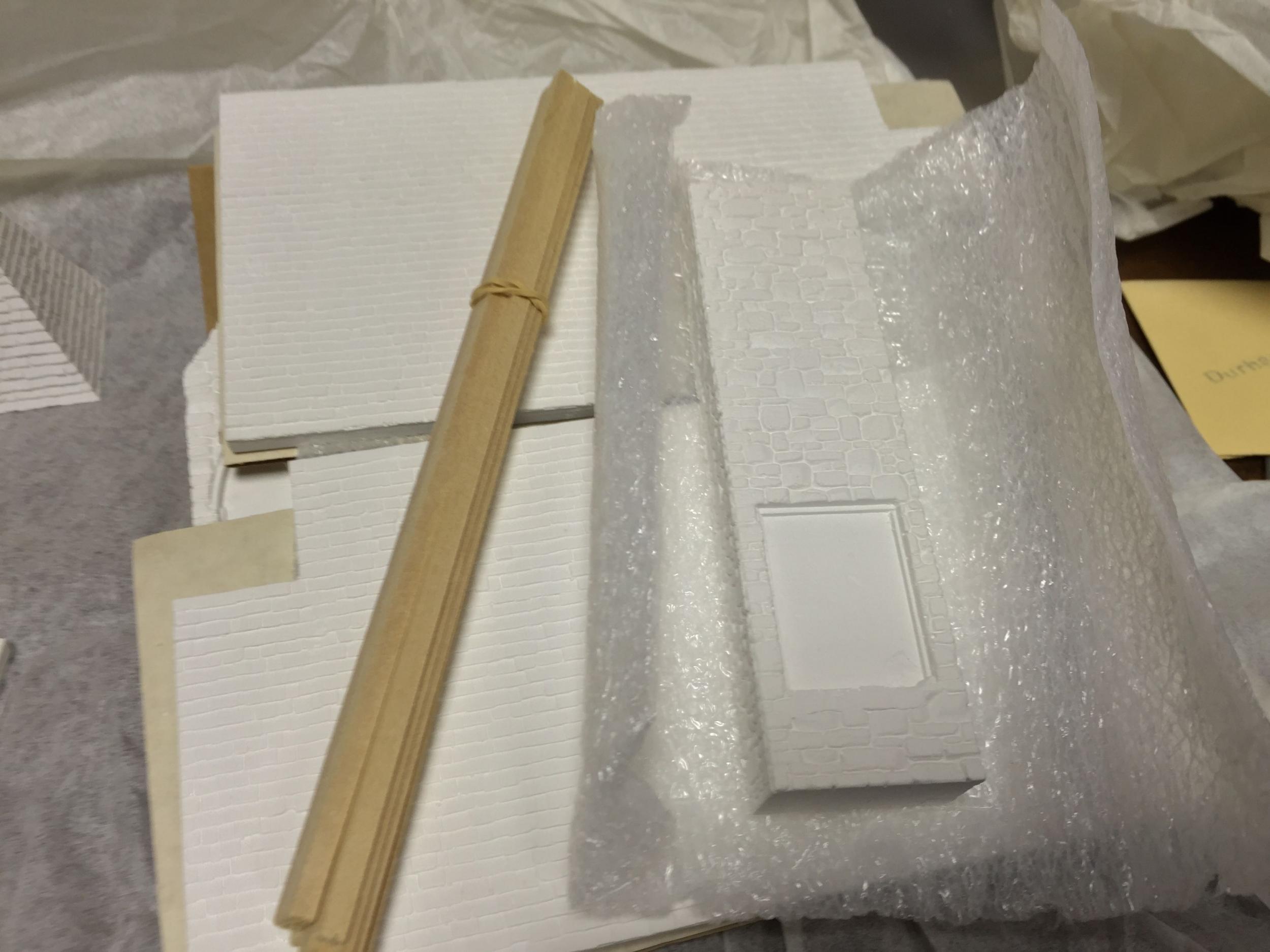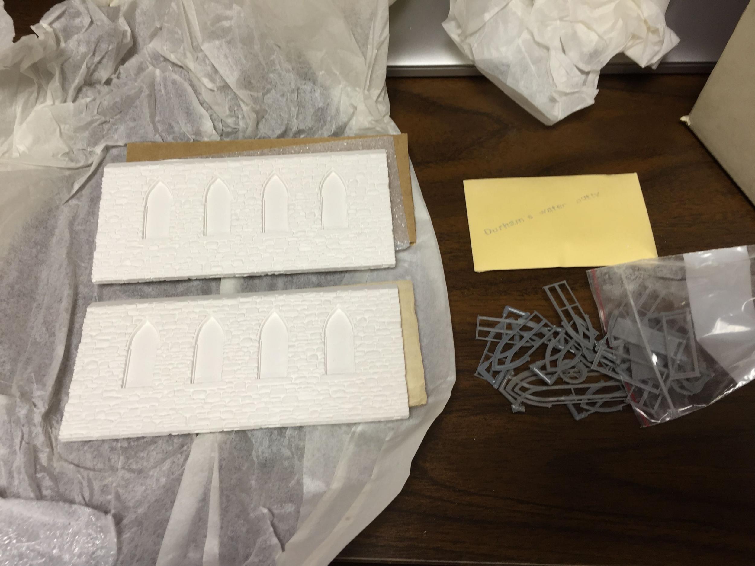 As we dig deeper into the box we find the two side wall castings, the window castings, and a packet with Durham's Water Putty.