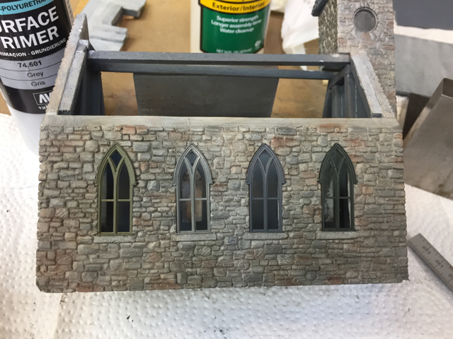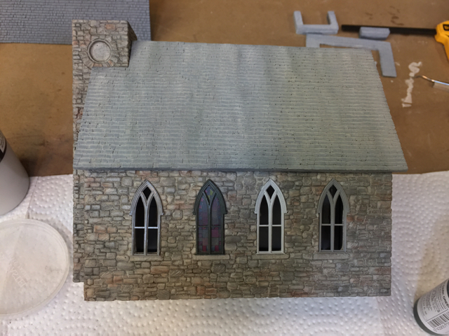 (top picture) which blends in with the stone.  I wanted to have just a little contrast so I went with a slightly darker grey shade.   Thanks for all the input - it was real interesting to see what everyone thought.  I really like the dark green with this stone color but not on a church.  If you follow my build thread you will find that I will use this color combination on future build. Now, it's time to paint window castings and finish the roof.