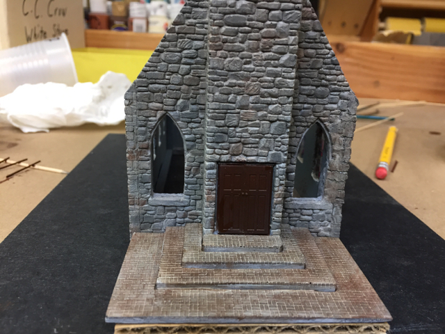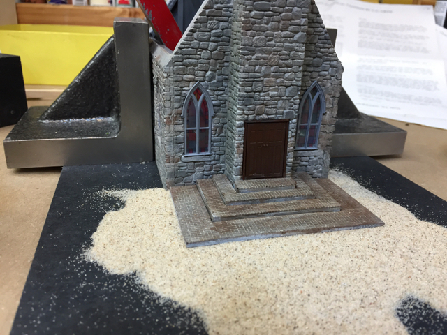 I have the window castings glued in on 3 sides of the church now.  I also added the first layer of sand to build up the area in front of the steps.