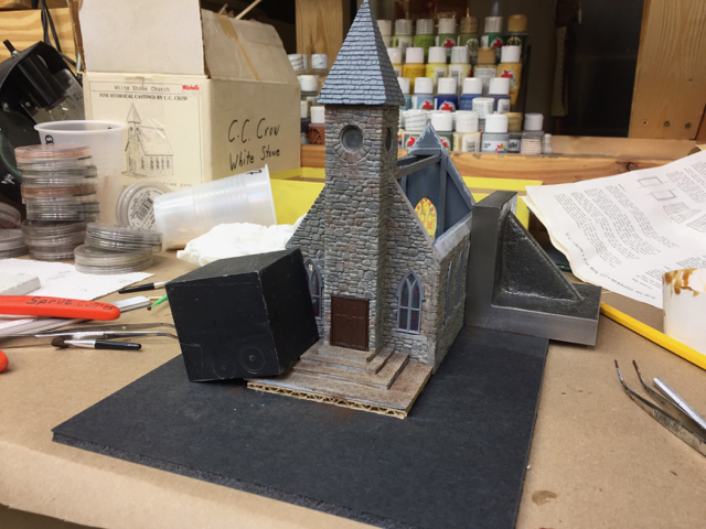 Finally, for today, I glued the church to the base board and started adding the window castings and stain glass.