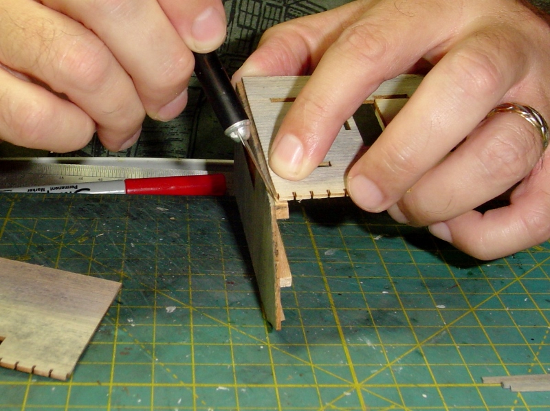 Some of the walls had some minor warping (no big deal) so I was checking to ensure that would be corrected when I started gluing them together.  The end of one wall, where there is no bracing, will butt up against the bracing from the adjoining wall so that should straighten it out.  However, as I was looking at it I noticed that the bracing was going to be a problem.  I braced the walls the way the templates in the instructions indicated but if you look closely at where the tip of my X-Acto knife is pointed you'll see that the bracing runs behind the slots cut in the walls for the rafter tails.  There's no way to install the precut rafter tail components with that bracing in the way.   :o