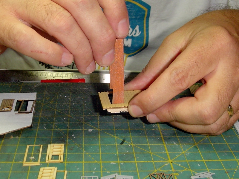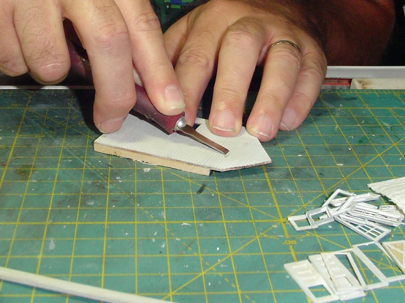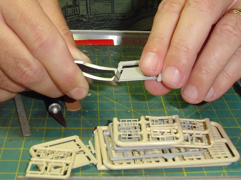 I clean up the edges of the plastic castings with an emery board.  If there's an flash on the mullions of the windows (where the emery board doesn't fit) I use the tip of the X-Acto knife to gently scrape it off.  For the metal castings I use a small set of files to clean up any unsightliness.   ;)