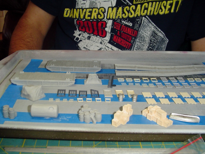 Once everything was cleaned up I taped some strips of blue painters tape, sticky side up, to an old jelly roll pan and started lining up everything to be primed.  I'll skip the actual priming part.  I just used a rattle can of gray primer from one of the big box stores.  My preference is to airbrush them with Floquil Primer but a.) my compressor is acting up and b.) I'm out of Floquil Primer and they don't make it anymore.   :'(