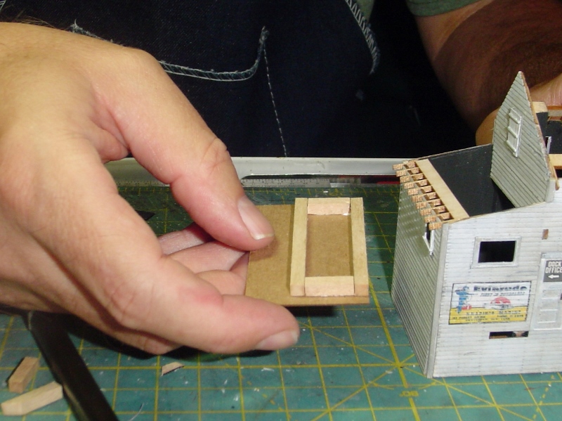 Using a chisel blade in an X-Acto handle I pry gently slide it under some of the clapboards and lift them up a bit.  Depending on how run down you want the structure you can twist it a bit and break off small slivers of the clapboard here and there.