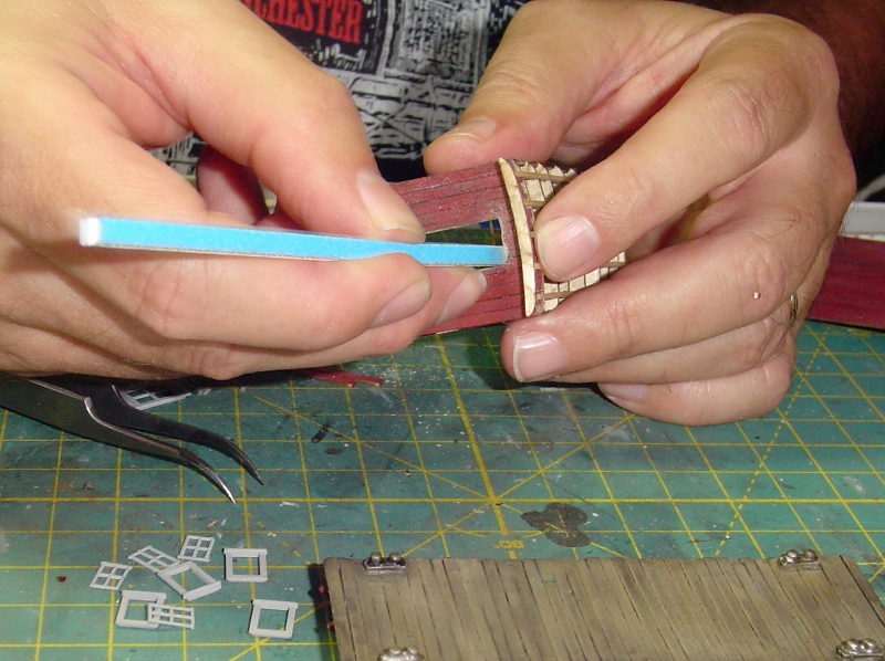 I also used the sanding stick (handy little things) to sand the paint off of the edges of the windows (these are two part assemblies) so they'd fit inside the frames without forcing them.