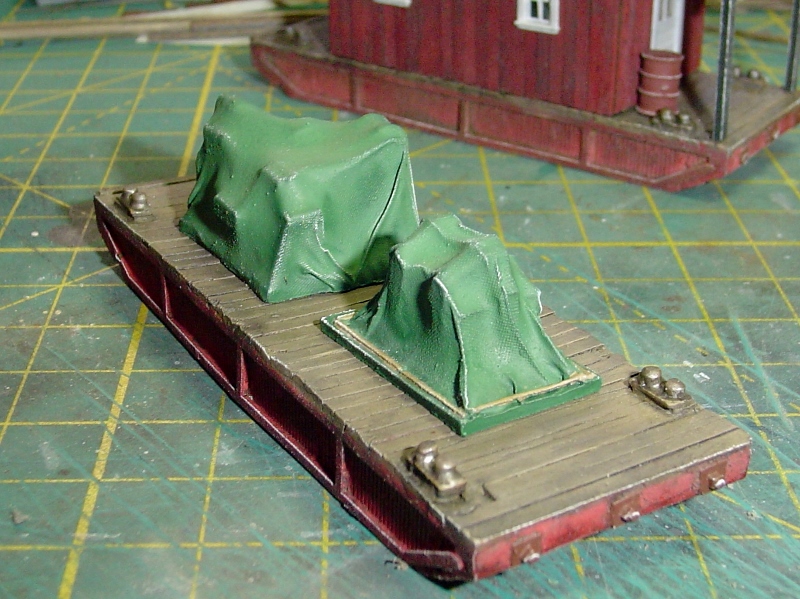 The roofing material for the Bait Boat that was included in the kit was single ply toilet paper.  I primed it with Floquil Primer (using an air brush) and then painted part of it with Grimy Black for the main roof and part with Depot Buff for the canvas cover that will be at one end of the shack.  I used 3M Sticky Notes to mask it and hold it in place.  Painters tape would have been too sticky for the toilet paper and would have torn it.  I cut the black portion into scale 3' strips.