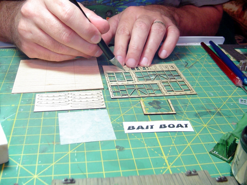 There are two little 'barges' or 'boats' included in Cundy Harbor.  Both have the same basic casting for the hull.  I decided to build these next since they'd be relatively quick compared to the structures.  The "Bait Boat" has a little shack that sits on top of the barge.  I started by removing the framing for the shack from the laser cut sheet.