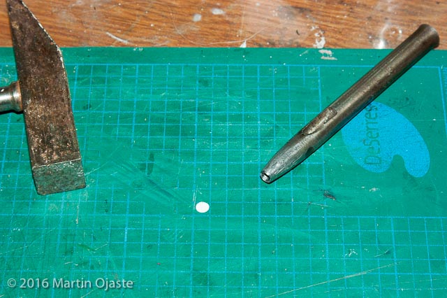 I dug around in the junk stuff from my Dad's workshop and found a very old leather hole punch. However, it was a 1/8" punch, so I drilled it out to 3/16" and tried to sharpen it as much as I could.