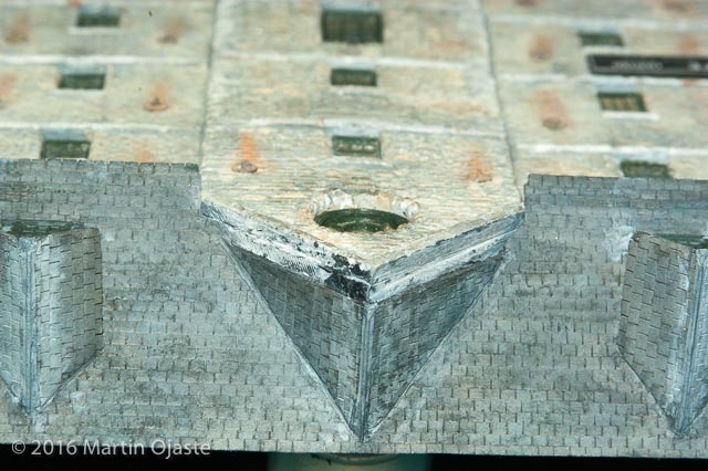 The wall braces were then epoxied onto the blocks where the ceiling.floor joists would have been. A series of rusting chalks were applied. First a light raw sienna wash below the brace, then a smaller wash of burnt umber and then a thinner line of orange. When dry it was scrubbed together with a stiff hogs hair brush. Later I tune the rusting to be less intense.